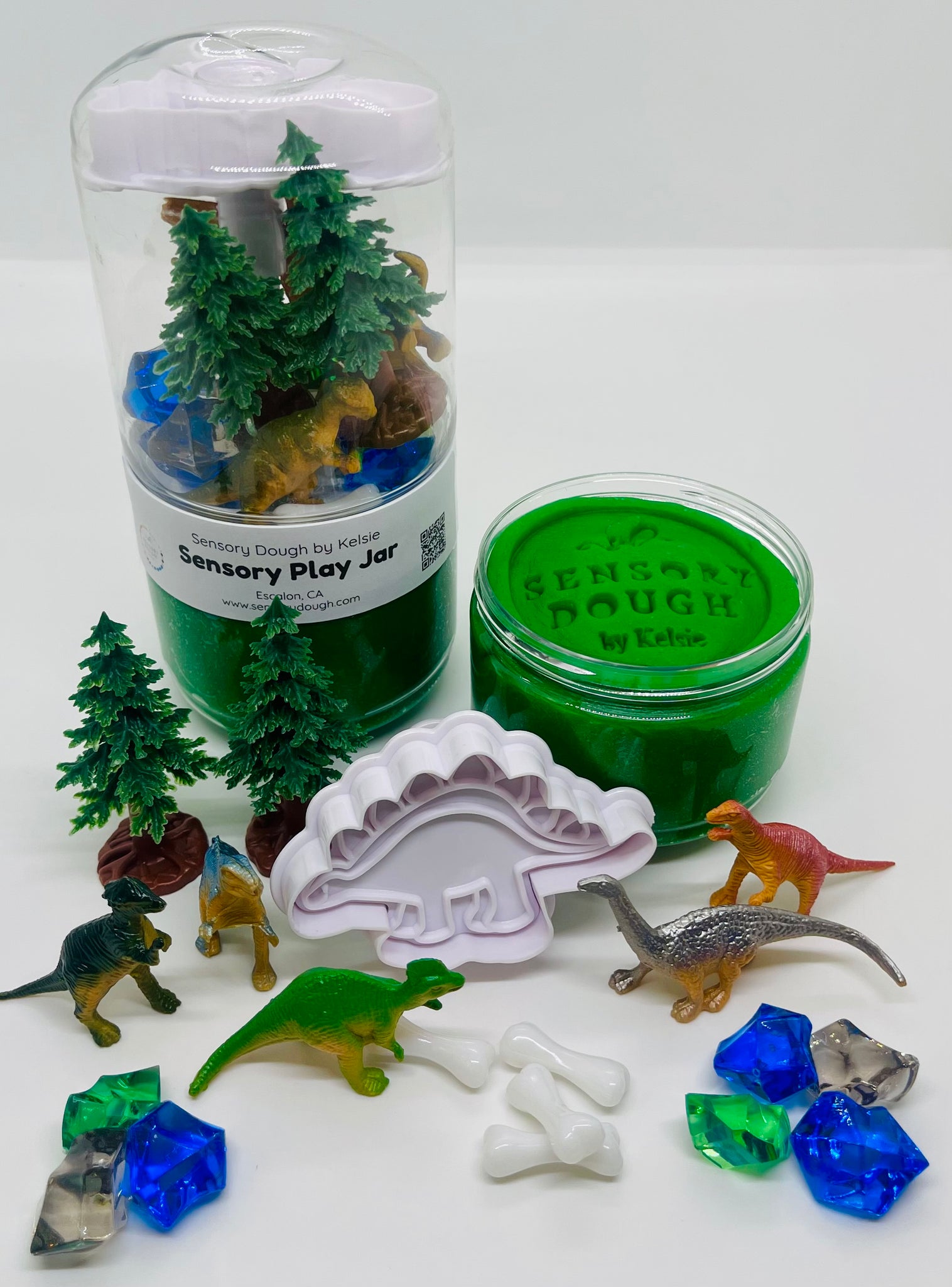 Dinosaur play kit comes with green lime sensory dough and dinosaur theme loose parts