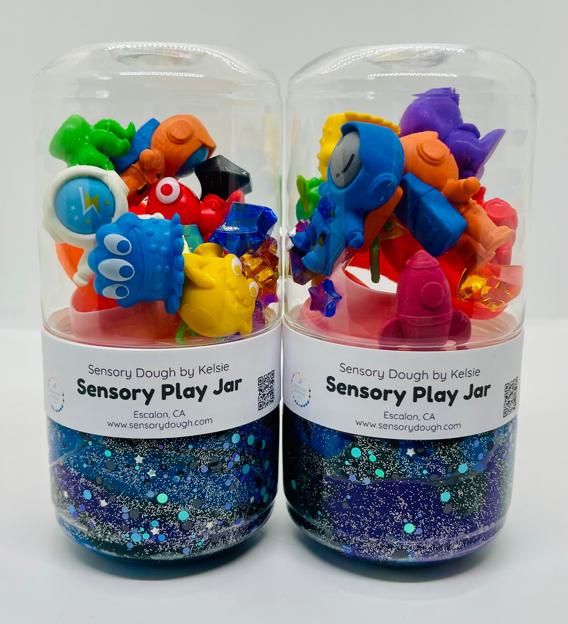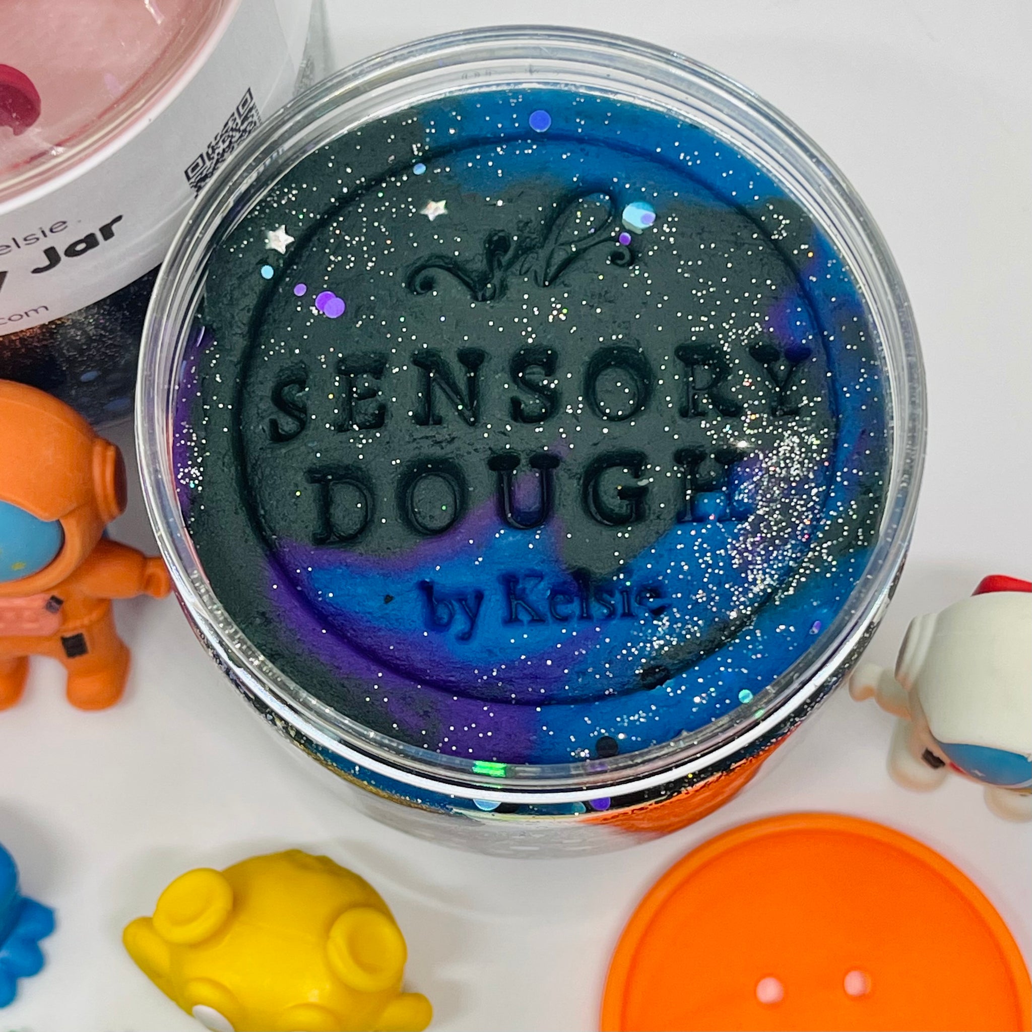Outer Space play jar comes with black/purple/blue glittery sensory dough and outer space theme loose parts